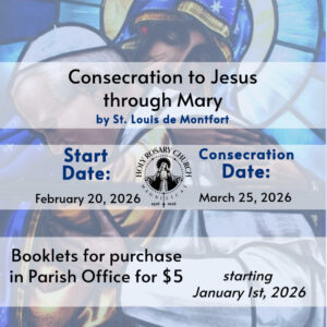 On January 1st, 2026, we will start selling the booklets of prayers that will guide us towards our parish-wide Marian Consecration on March 25th, 2026—the feast of the Annunciation of the Angel Gabriel to Mary. You can purchase a booklet from the Parish Office, for $5 each, and we will begin the prayers on February 20th, 2026.