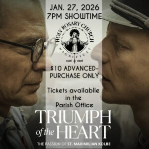 On Tuesday, January 27th at 7pm, in the Parish Hall, we will be showing the movie on St. Maximilian Kolbe, titled "Triumph of the Heart." We are only selling a maximum number of 50 tickets at $10 each, and tickets must be purchased in advance (first-come-first-serve), in the Parish Office.
