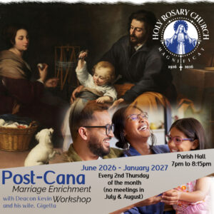 How can we maintain the joy and love of Christ between spouses, long after the wedding day? Deacon Kevin and his wife Gigetta will lead a Marriage Enrichment Workshop from June 2026 to January 2027, every 2nd Thursday of the month (no meetings in July & August), from 7:00 to 8:15pm in the Parish Hall.
